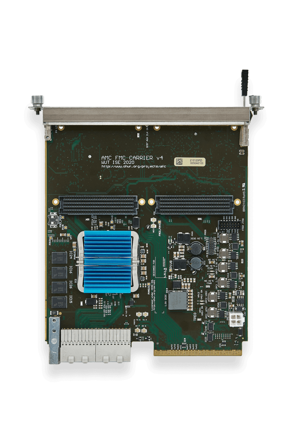 The AFC V4 is a versatile AMC FMC board, partially based on the SPEC design (power, White Rabbit clocks), designed to support four-channel, 16-bit FMC ADC boards, used for example in Sirius BPM electronics. The module features an extremely flexible synchronization system that allows connection to any clock source — including telecom, FMC, or FPGA — while ensuring full White Rabbit compatibility. It is equipped with a Xilinx Artix-7 FPGA and 2 GB DDR3 SDRAM, providing high computational performance and broad communication capabilities.